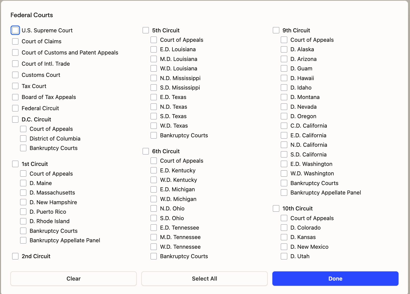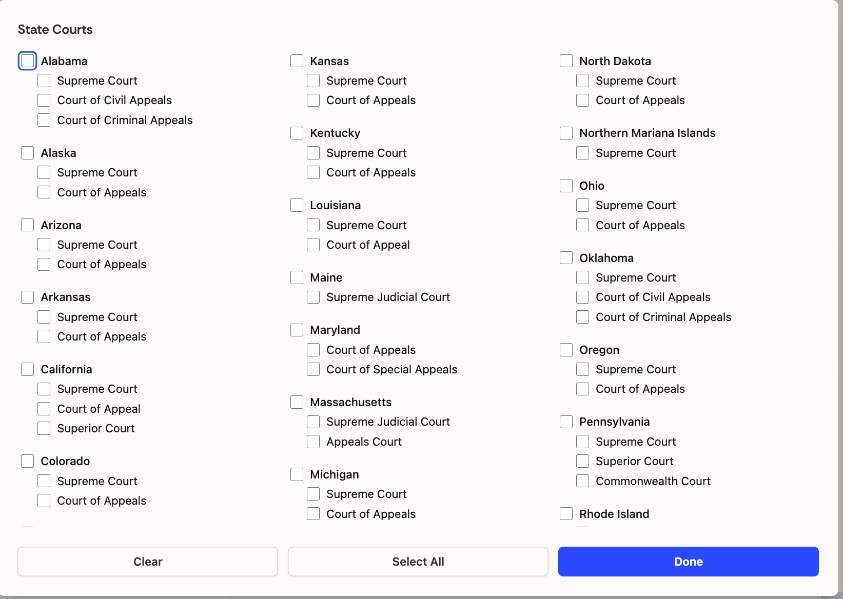 Select Jurisdictions: You may select all or individual jurisdictions to narrow down your search results. Focused selections help Haiku return results around the most relevant cases.